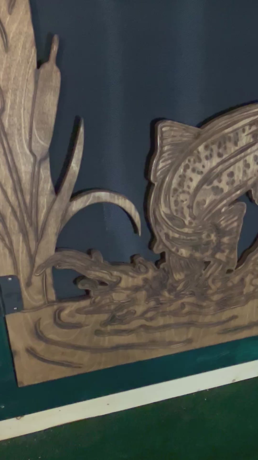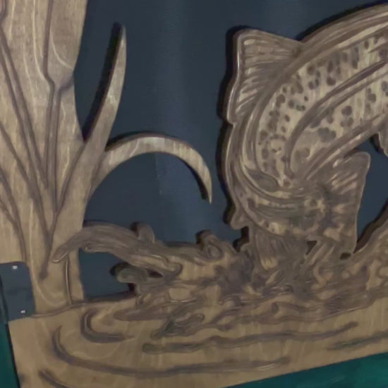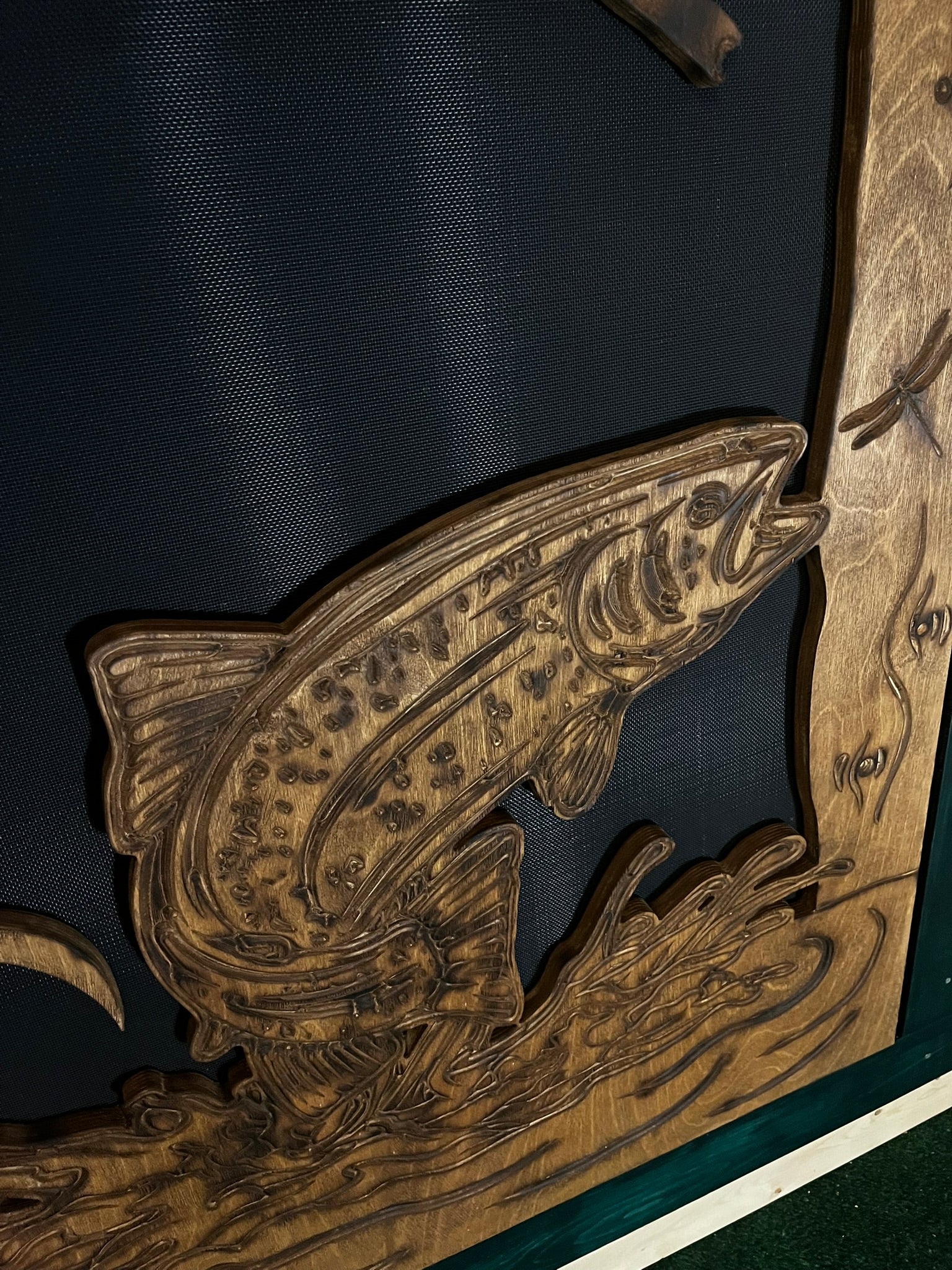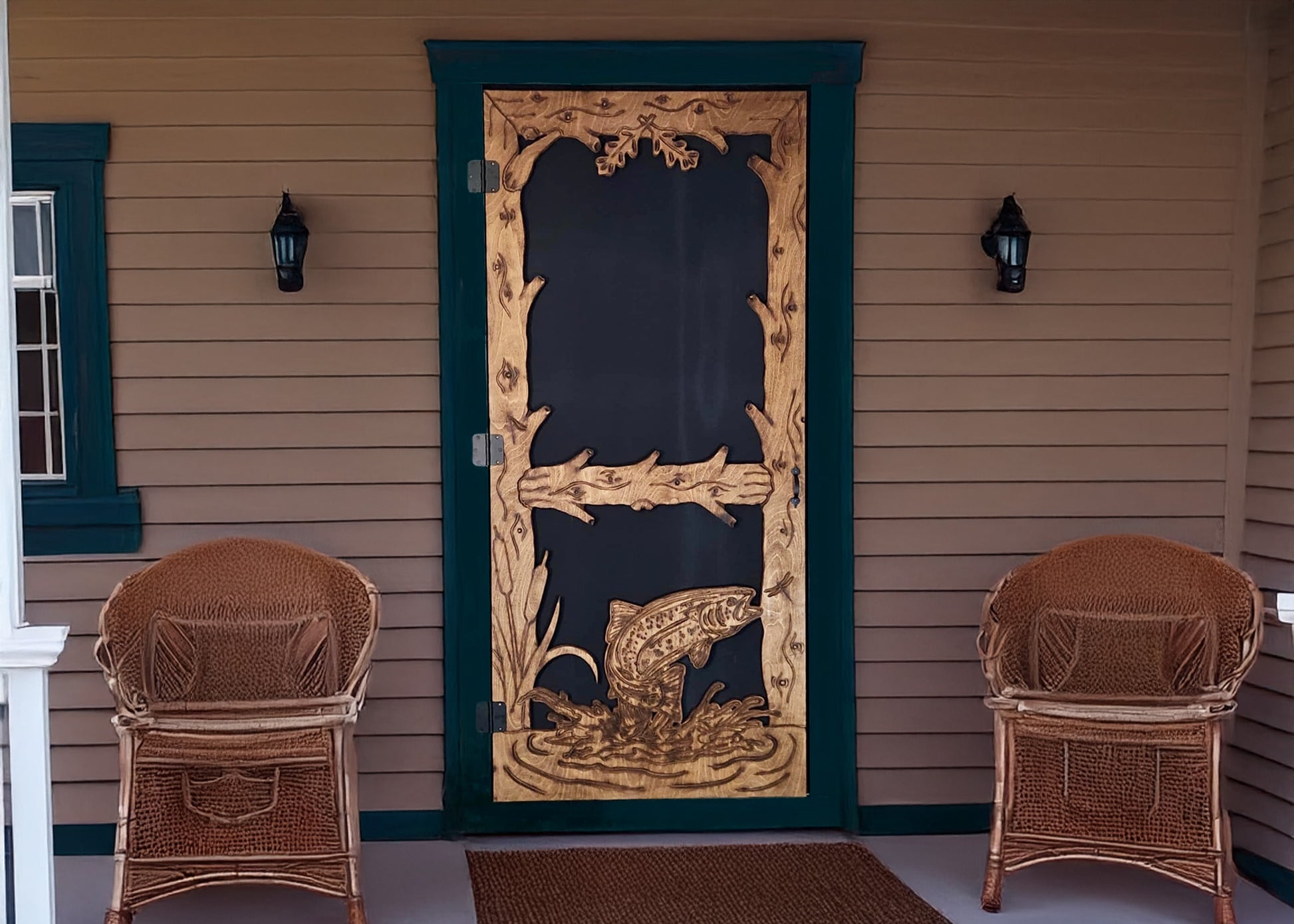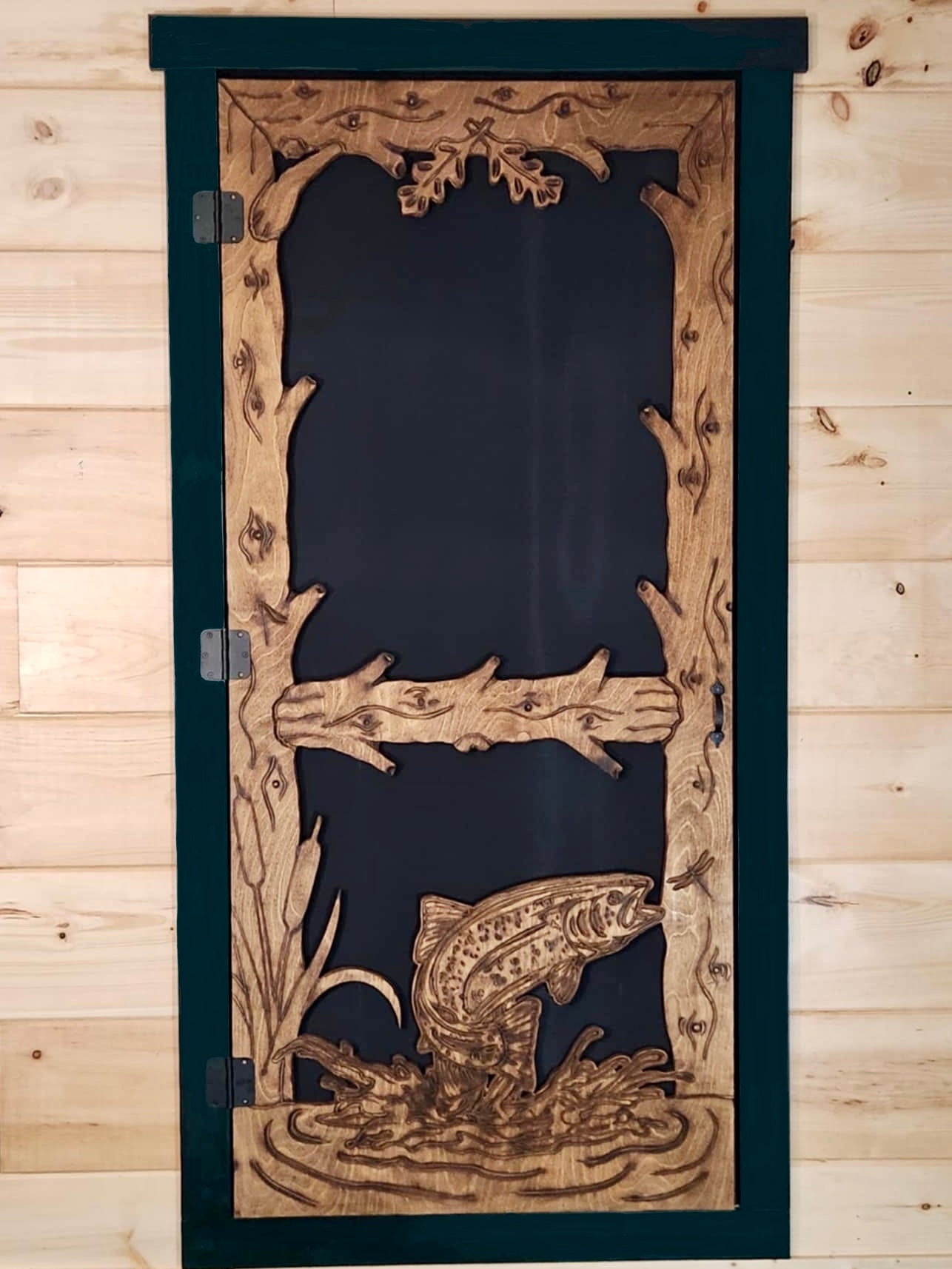 Introducing the Jumping Trout Screen Door, a rustic addition to any home. Featuring a majestic brook trout in the full action going after a dragonfly, this door adds a touch of nature to your doorway. Made with exterior grade Baltic birch and durable aluminum screen and finished with a high-quality log cabin oil stain, this door will last much longer than most wooden screen doors. Experience the beauty of the great outdoors every time you enter and exit your home.