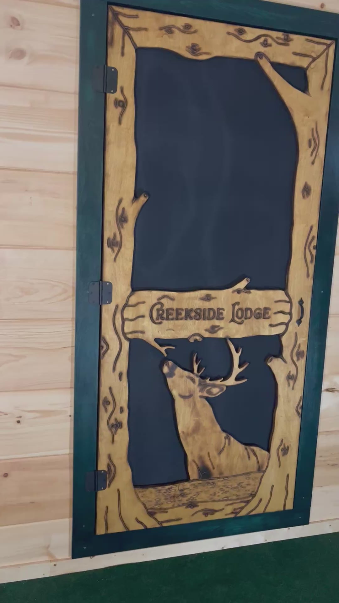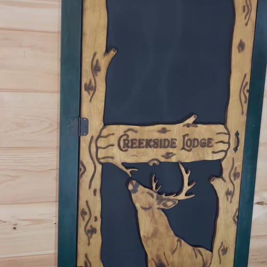 Introducing the Whitetail Deer Screen Door, a rustic addition to any home. Featuring a majestic whitetail deer design, this door adds a touch of nature to your doorway. Made with exterior grade Baltic birch and durable aluminum screen and finished with a high-quality log cabin oil stain, this door will last much longer than most wooden screen doors. Experience the beauty of the great outdoors every time you enter and exit your home.